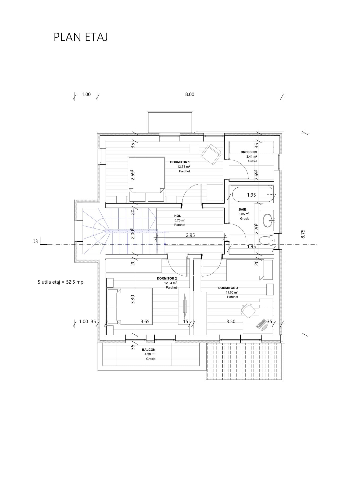 – la etaj: 3 dormitoare, 1 baie , . 1 dresing, 1 hol.