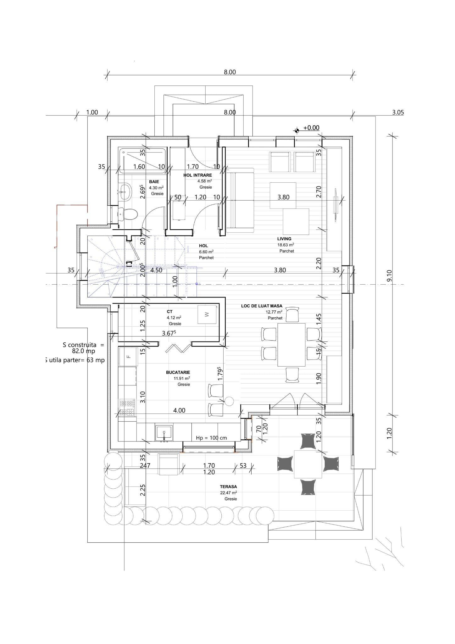 – la parter: 1 living, 1 bucătărie, 1 baie, 1 debara, 1 terasă